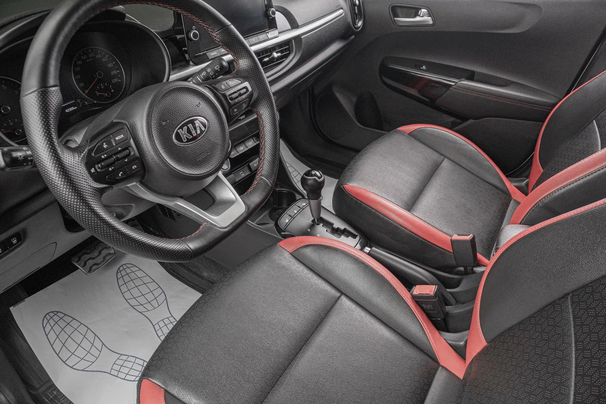 Интерьер с отделкой искусственной кожей, с красными вставками